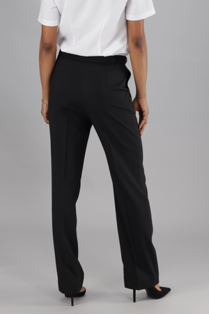 Expertly designed for a comfortable fit these high rise pants are the ultimate addition to any wardrobe. Featuring an adjustable waist and practical pockets, these black stretch pants offer both style and functionality. Enjoy the perfect blend of comfort and convenience with Helga.